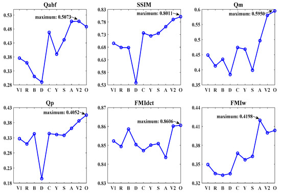 To evaluate the proposed method more comprehensively, we use the six indicators to test the fusion performances on the TNO and RoadScene datasets containing 30 sets of images, and these results are shown in Figure 6 and Figure 7. From Figure 6, we clearly observe that our method achieves the best average values for all six indicators. Figure 7 demonstrates that our method performs well as it achieves the four highest averages and two top-three highest averages among the six metrics. Judging from the overall trends of the ten methods on the two datasets, our method has a high probability of exceeding the performances of other state-of-the-art methods.