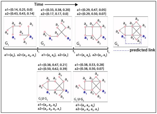 Although link prediction is a time-evolving network analysis model that measures the probability of future links by analyzing the existing links in the network, traditional similarity metrics-based methods generally overlook taking the evolutionary information of dynamic networks into account. Dynamic networks evolve through simultaneous arrivals and/or departure of actors as well as the creation and/or deletion of links among these actors. These time-varying networks, also known as “temporal” or “longitudinal” networks, are suitable for describing entities whose dynamics change over time. The combination of the technical possibility of storing, processing, and representing large-scale datasets and the increased proliferation and ubiquity of real-world dynamic network datasets has led dynamic network analysis to gain considerable research interest to understand the underlying mechanisms of their evolutionary dynamics better. Recently, researchers have attempted the issue of dynamic link prediction or link prediction in dynamic networks. Dynamic link prediction is the process of inferring the possibility of future links among the dynamic entities or network actors through exploring historical or temporal information []. Different dynamic link prediction methods explore a wide range of techniques. Most of the techniques used a wide variety of structural and network topological features to compute the likelihood of link formations. For example, Zhang et al. [] used a node (i.e., actor) centrality-based temporal link prediction where the authors distinguished the contributions of common neighbors to connection likelihood by their eigenvector centralities. By considering the importance of nodes as the probability of attracting other nodes, Wu et al. [] used an eigenvector-based node ranking strategy along with a forecasting method called Adaptive Weighted Moving (AWM) for dynamic link prediction. Chi et al. [] categorized the nodes into different levels based on the influence strength of the node compared to its neighbors that change over time. The authors computed the connection probability between a pair of nodes using their corresponding levels of influence strength and the attraction force between them to predict the missing links in dynamic networks. Chen and Li [] formulated the link prediction problem in dynamic networks as an optimization problem that not only collectively leveraged the structural and temporal information to better infer a low-rank representation for each node but also preserved the deep network structure via high-order proximity among nodes. The authors also used an efficient block coordinate gradient descent approach to address the optimization problem.