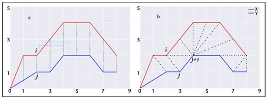 Here,  represents the optimal warping path defined between the ith and jth component of two time series. In Figure 2, this study presents a comparable representation of calculating similarities between two temporal sequences using traditional distance measures (Figure 2a) (e.g., Euclidean) and the DTW method (Figure 2b). In this figure, the dashed lines represent the distance between corresponding points in both time series. The traditional approach aligns the ith point in one time series with the corresponding jth point of the other, whereas DTW provides nonlinear alignment to produce a more intuitive similarity measure and allows similar shapes to match (, ) even if it requires localized stretching along the time axis. In DTW, the difference between these time series is the warped path distance which is measured by summing the distances between each pair of points connected by the dashed lines in the figure. Considering the temporal similarity measures using the DTW technique, this study first computes the structural and neighbourhood dynamicity of actor pairs at every timestamp of temporal network snapshots. Secondly, using temporal sequences of these dynamicity values, this study applied the DTW technique to measure temporal similarity between them. The temporal similarity between the time series of actors’ dynamicity values will represent their evolutionary proximity or similarity. Therefore, values of first and second dynamic similarity metrics, developed in this study for actor pair a and b considering structural and neighbourhood dynamicity values, are defined as follows: