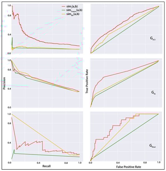 P–R curves (left column) and ROC curves (right column) for undirected network  (top row), co-authorship network  (middle row), and directed network  (bottom row).