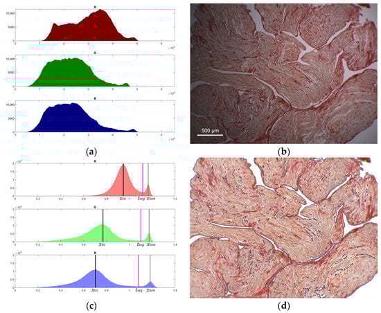 Following the processing of the white images, the analysis proceeded with the processing of the histological images. The first step of the procedure is exemplified in Figure 3 for a single section image. The RGB histograms (Figure 3a) of the original image (Figure 3b) had values spread across the whole intensity range because of the nonuniform field illumination, which manifested as a decrease in exposure in the periphery of the image (i.e., vignetting effect). In the histograms, the values corresponding to the luminal space formed a low and wide peak with overlap with tissue values, which hindered an automatic threshold-based separation between tissue and lumen values. The white-balanced image (Figure 3d) was obtained applying Equation (8), which reduced the non-uniform illumination of the lumen. Following white-balance correction, RGB histograms (Figure 3c) presented a bimodal distribution with a sharp lumen peak, suitable for automatic analysis. The correction reduced the variability of the lumen pixels for [R G B] channels (expressed as relative standard deviation with respect to the mean) from [25.3 23.9 24.9] % in to [2.6 3.2 6.1] % in . The peaks corresponding to lumen and tissue areas were automatically detected (Figure 3c), allowing normalization of with respect to the lumen RGB levels. The white-balanced image represented the transmittance of the sample (Figure 3d). The luminal space was segmented from the tissue area of the image by thresholding at the minimum level () between the peaks. The obtained tissue mask is contoured in black in Figure 3d. In the shown case, the tissue area covered 90.1% of the image area. The automatic segmentation assumes that the lumen/background peak is separated by a valley from the tissue values, and this also requires a minimal lumen area in the image. In the analyzed database, the condition was met in all the images, which presented a luminal area > 5% in the field of view.