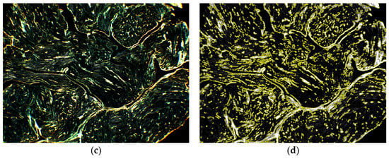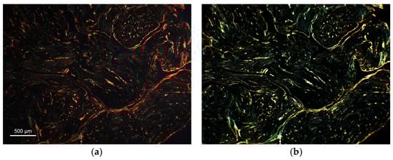 The regular spacing of collagen fibrils into fibers provides them with positive intrinsic birefringence []. This intrinsic birefringence can be enhanced by a specific staining process to point out even thin collagen fibers. For instance, picrosirius red staining is usually the preferred staining, since its peculiar chemical properties results in higher specificity and selectivity for collagen and less fading problems with respect to other techniques, such as van Gieson and trichrome techniques [,,]. The intrinsic and/or staining-induced birefringence results in collagen fibers appearing bright versus a dark background when illuminated in polarized light.