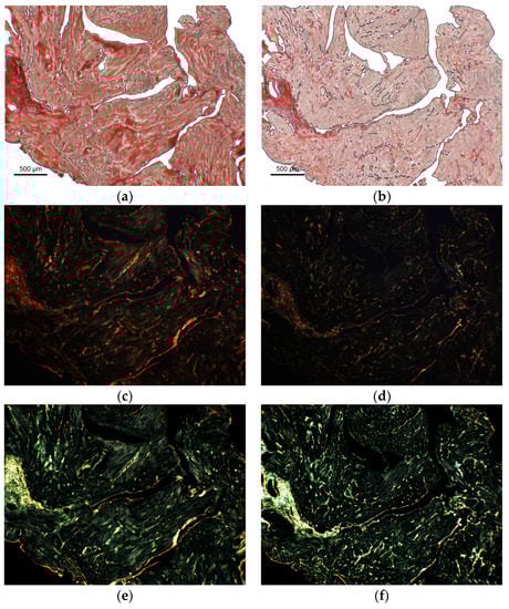 Figure 6 shows representative examples of the method application in two patients with different arrhythmic profiles. In the exemplary SR patient (left panels), the red stain in the bright-field image occupied limited areas (Figure 6a). This suggested the presence of a small amount of fibrosis, which was confirmed by the low intensity of the processed birefringence signal (Figure 6c). The binary classification performed by the algorithm on the birefringence signal yielded a value of 3.4% (Figure 6e). In the exemplary AF patient (right panels), both the red stain and the processed birefringence signal were much more intense and occupied a much larger area (Figure 6b,d), resulting in an estimated collagen fraction of 18.9% (Figure 6f).
