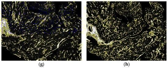 The combination of bright- and dark-field images for the segmentation of background and collagen is an original aspect of our algorithm with respect to the literature [,,,,,]. The majority of studies using picrosirius red staining in combination with polarized light employed bright-field illumination to detect collagen [,,,]. In the study by Hadi et al. [], a semi-automatic threshold-based approach was applied to detect collagen from bright-field images. A color transformation from the RGB to the CIE LAB color space was performed and specific thresholds, associated with the staining, were applied to detect each specific tissue compartment (i.e., lumen, cardiomyocytes, or collagen fibers). However, the analysis of the sole bright-field images may be limited by the fact that neither collagen fiber color nor brightness are uniform (i.e., thicker fibers appear deep red and thin fibers appear bright pink and are more difficult to detect), which may hinder the proper definition of thresholds. An alternative approach was implemented by Rich et al. [], who used color threshold analysis on dark-field images to reveal the structure of collagen fibers of different dimensions. Of note, the algorithm controlled for the mix in color associated with fiber density and classified the segmented collagen into its constituent parts (thick or thin fibers) for the resolution of complex collagen configurations and improved visualization. In our algorithm, we did not distinguish collagen densities, but combined the information of red, blue, and green colors by an average approach. Our approach quantified the overall content of different types of fibers, but not their distinction. In order to detect different collagen types, our approach may be slightly modified by converting the birefringent signal, given in RGB, to hue formulation and finding appropriate thresholds for different fibrosis population in the color spectrum. Alternatively, information on collagen patterns may be obtained post-detection, submitting the extracted mask to algorithm for spatial pattern extraction. In its seminal work, Whittaker et al. [] used both dark-field and bright-field images for the quantification of collagen, but the approach implied hardware manipulation during image acquisition. Blue-filtered bright-field images were used to detect the muscle tissue, which was then subtracted from the polarized image, where both muscle and collagen appear bright. However, the brightness of muscle in the bright-field image needed to be adjusted by manual manipulation of the microscope lamp.
