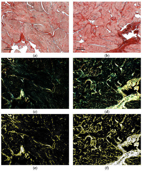 - Lattouf, R.; Younes, R.; Lutomski, D.; Naaman, N.; Godeau, G.; Senni, K.; Changotade, S. Picrosirius Red Staining: A Useful Tool to Appraise Collagen Networks in Normal and Pathological Tissues. J. Histochem. Cytochem. 2014, 62, 751–758. [Google Scholar] [CrossRef] [PubMed]