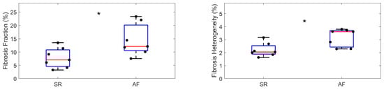 Categorical variables were expressed as numbers or percentages. Continuous variables were expressed as mean ± standard deviation (SD) or median [IQR] according to data normality (Shapiro–Wilk test). The presence of statistical differences between the amount and heterogeneity of fibrosis in the SR versus AF group was evaluated by a non-paired t-test or Mann–Whitney test, as pertinent. A p-value < 0.05 was considered statistically significant. All the analyses were performed in Matlab (The MathWorks, Inc., Natick, MA, USA).