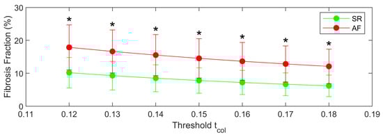 Sensitivity analysis on the effects of collagen threshold on fibrosis detection. Fibrosis fraction for the sinus rhythm (SR, green) and atrial fibrillation (AF, red) groups are displayed as a function of the threshold . Both parameters displayed a progressive decrease at the increase of the threshold, but differences between the two groups remained statistically significant at all threshold values. Data are expressed as mean (dot) ± standard deviation (whiskers) over the two subgroups. *, p < 0.05. N = 14.