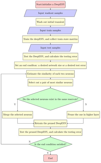 In order to overcome the above difficulty, a new neuronal similarity-based iterative pruning merging algorithm (NS-IPMA) is proposed to iteratively prune out or merge the most similar neurons in DeepESN. In NS-IPMA, a pair of the most similar twin neurons, which are regarded as redundant neurons in the network, are selected out iteratively; then, if they exist in different layers, the one in the higher layer will be pruned out, and if they are in the same reservoir, they will be merged into one neuron, which works as the substitution of antecedent twin neurons. Quantitative estimation of neuronal similarity plays an essential role in determining the redundant neurons that should be pruned out. Four neuronal similarity estimation criteria of NS-IPMA approaches were attempted, including the inverse of Euclidean distance, Pearson’s correlation, Spearman’s correlation and Kendall’s correlation. Reducing the network size is a directly effective approach to improve the generalization performance of a neural network because pruning out neurons will lead to a reduction in network size to verify the effectiveness of the NS-IPMA method. The DeepESNs pruned by the NS-IPMA method were compared with unpruned DeepESNs, whose number of neurons in each reservoir is the same. The pruned DeepESN and the unpruned DeepESN were compared with an equal number of layers and equal number of total neurons. The results of the experiment on two chaotic time series prediction tasks showed that the NS-IPMA method has good network structure adaptability, and the DeepESNs pruned by the NS-IPMA method has better generalization performance and better robustness than the unpruned DeepESNs, indicating that the NS-IPMA method is a feasible and superior approach to improving the generalization performance of DeepESN. The NS-IPMA method provides a novel approach for choosing the appropriate network size of DeepESN, and it also has application potential in other RNNs and DNNs.