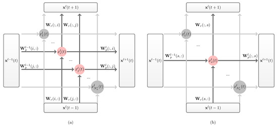 - If selected neurons are in the same reservoir (note as and ), merge them. As diagramed in Figure 5, is the son neurons merged as the substitute of its parents and . l is the reservoir layer where and exist. The related weight matrix , and is refreshed as follows:if , perform as ; if , does not exist.
