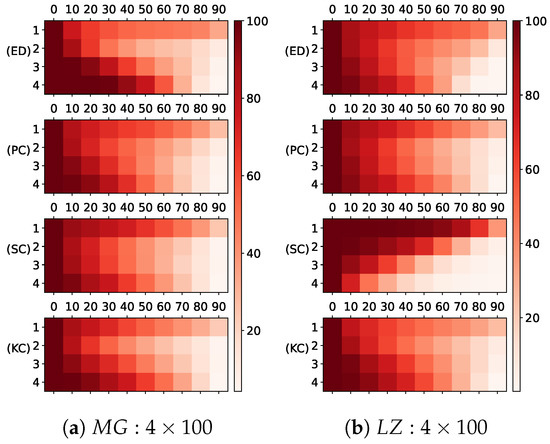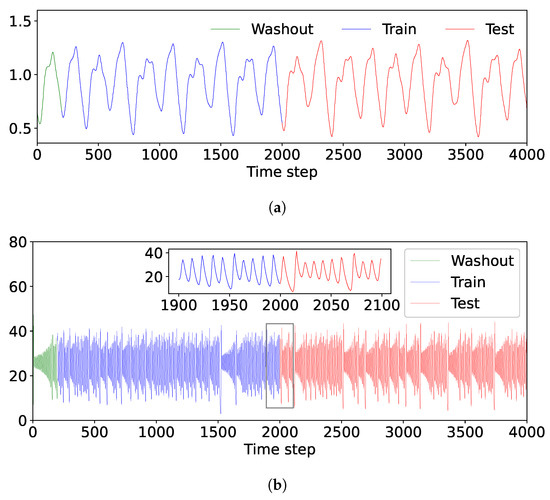 where , , and are constant parameters. The nonlinearity of the system increases as the time delay parameter increases. The system shows chaotic behavior when . To generate the time series used here, is set to 31, and the integration step size is set to using the jitcdde Python engine to solve delay differential equations at discrete equally spaced times. The data were then sampled by to form the Mackey–Glass () dataset with 4000 data points. A Python library [27] was used to implement this process.