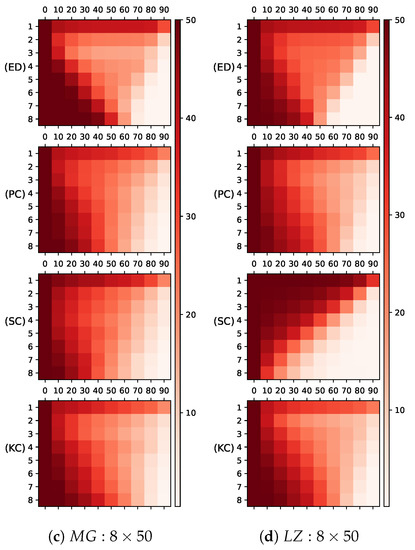 The figure shows the number of neurons remaining in each layer of DeepESN, pruned by different similarity estimation criterion-based NS-IPMA methods. The vertical axis indicates the layer index, the horizontal axis indicates the percent of pruned neurons in the initial total number of neurons, the mesh color indicates the number of remaining neurons, and the darker color indicates more neurons remaining. (a): Initial 4 layer reservoirs with 100 neurons in each reservoir on dataset; (b): Initial 8 layer reservoirs with 50 neurons in each reservoir on dataset; (c): Initial 4 layer reservoirs with 100 neurons in each reservoir on dataset; (d): Initial 8 layer reservoirs with 50 neurons in each reservoir on dataset.