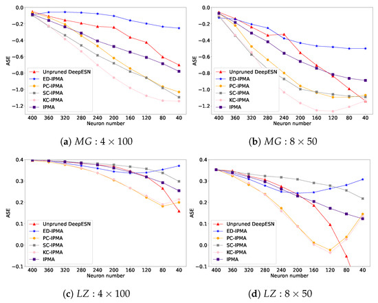 Similarly, from Figure 8, the DeepESN pruned by ED-IPMA maintained a minimum ASE loss as the number of neurons decreases, and we suspect that there were some hidden relationships between the Euler distance and Renyi’s quadratic entropy. From Table 1, the unpruned DeepESNs had a greater standard deviation of the minimum testing NRMSE compared to the pruned DeepESN, indicating that the NS-IPMA method has good robustness.