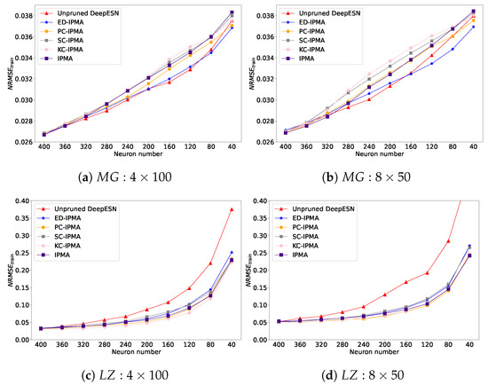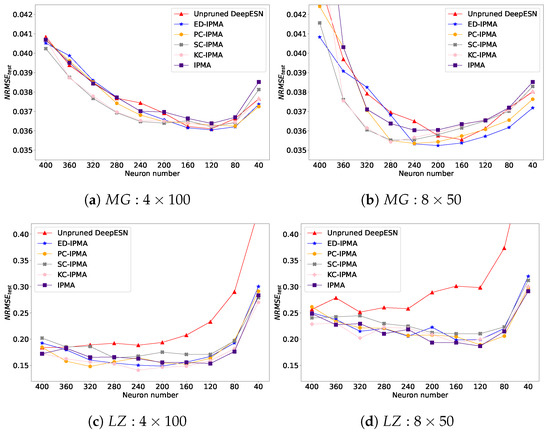 On the MG dataset: From Figure 10a,b, in the early stage, the testing error of DeepESN pruned by SC-IPMA and KC-IPMA dropped rapidly; later, DeepESN pruned by ED-IPNA and PC-IPMA performed best when the majority of neurons had been pruned. From Table 1, although ED-IPMA achieved the best extreme generalization performance, the pruned DeepESNs had no obvious improvement in the mean value of minimum testing NRMSE compared to the unpruned DeepESN.