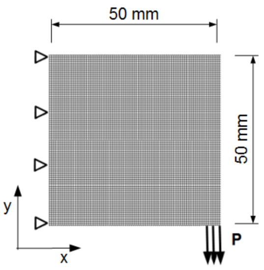 Following the papers [22,23,24,25] the square structure presented in Figure 2 has been chosen as the introductory example illustrating the implementation of the proposed CA approach to the topology optimization of graded multi-material structures. The FGM material defined by Equation (7) was utilized, where the Young modulus varies in one direction as the function of variable x. For this example, stands for normalized Young’s modulus and α = −0.06 is the coefficient which defines a change in the material properties within the domain. While dealing with the FGM topology optimization, the material interpolation schemes, i.e., SIMP in Equation (5) and RAMP in Equation (6) can be rewritten as FGM-SIMP and FGM-RAMP in the form of Equations (10) and (11), respectively. The structure is loaded with the force P = 1 N distributed in the nodes along the edge of 2 elements (see Figure 2), and the Poisson ratio value for all materials is set to 0.35 for all experiments.