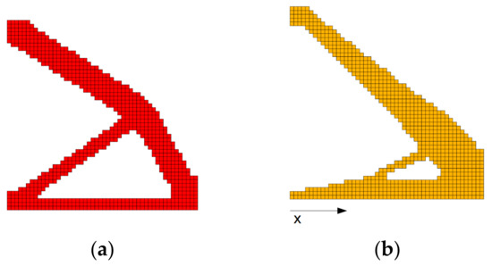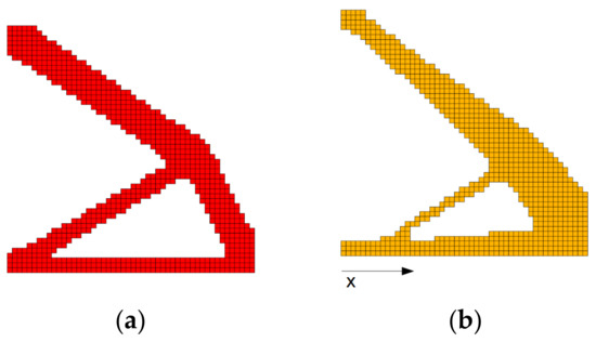 Final topologies obtained for square structure for FGM-SIMP material interpolation scheme, x-direction of material gradation: (a) uniform material, minimal compliance: 2.588 Nm; (b) graded material according to Equation (7), minimal compliance: 15.427 Nm.
