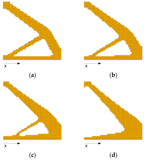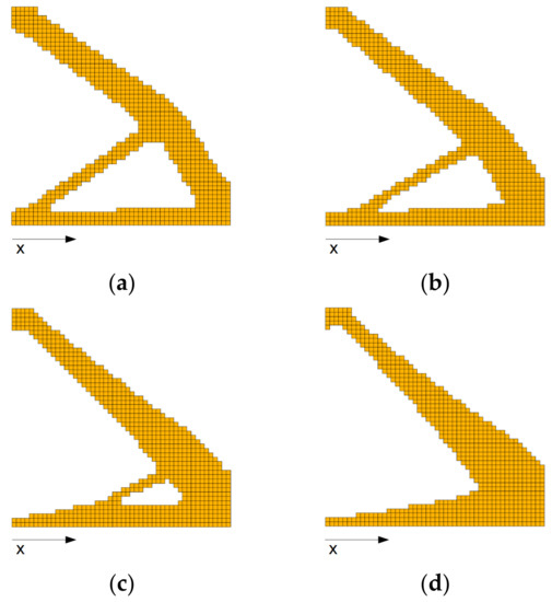 Final topologies obtained for square structure using the FGM-SIMP material interpolation scheme, x-direction of material gradation: (a) α = −0.02, minimal compliance: 4.386 Nm; (b) α = −0.04, minimal compliance: 7.919 Nm; (c) α = −0.06, minimal compliance: 15.427 Nm; (d) α = −0.08, minimal compliance: 31.656 Nm.