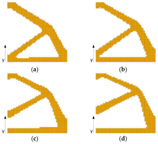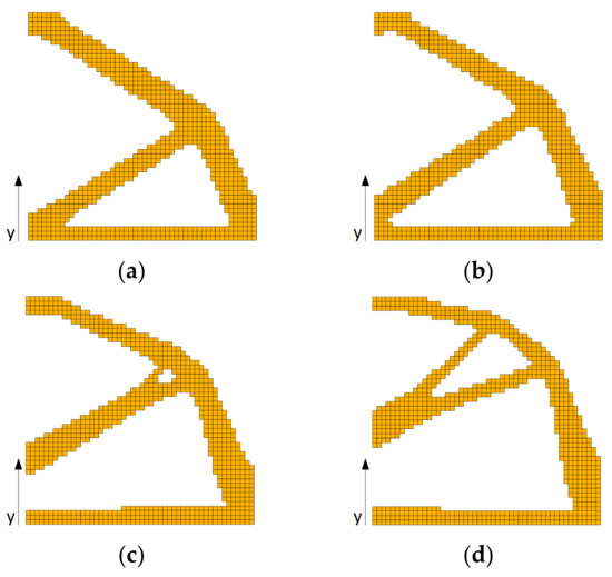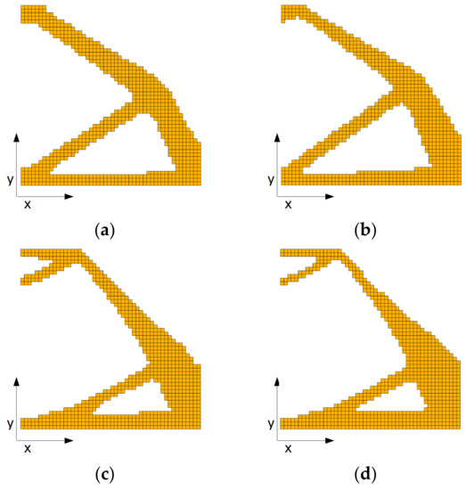 Final topologies obtained for square structure for the FGM-RAMP material interpolation scheme and x and y-directions of material gradation: (a) α = −0.02, β = −0.02, minimal compliance: 8.333 Nm; (b) α = −0.04, β = −0.04, minimal compliance: 32.581 Nm; (c) α = −0.06, β = −0.06, minimal compliance: 152.936 Nm; (d) α = −0.08, β = −0.08, minimal compliance: 819.221 Nm.