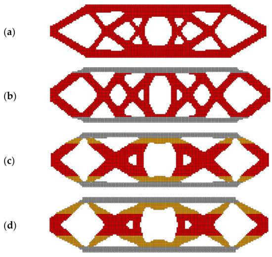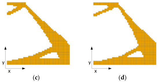 Two sets of different E1 to E2 ratios were examined: E1 = 1011 Pa, E2 = 2·1011 Pa and E1 = 1011 Pa, E2 = 1012 Pa. The Poisson ratio value for all materials is set to 0.35 for all experiments. The final topologies obtained for all the cases indicated in Figure 6 are presented in Figure 13 and Figure 14.