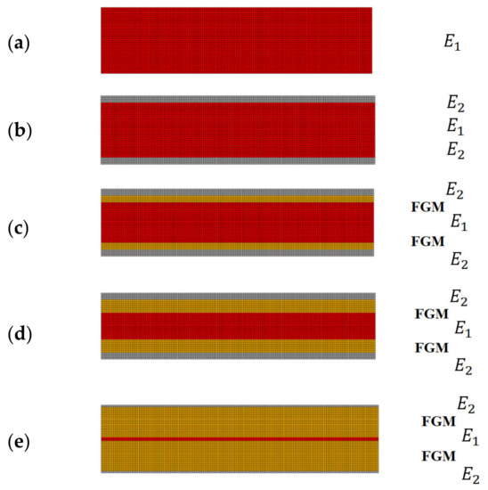 The materials distribution for initial rectangular structure: (a) one material structure; (b) two materials structure: E1—red color, E2—gray color, E1 < E2; (c) two materials structure: E1—red color, E2—gray color, E1 < E2 including 4 layers of FGM interface—yellow color; (d) two materials structure: E1—red color, E2—gray color, E1 < E2 including 8 layers of FGM interface—yellow color; (e) FGM structure: E1—red color, E2—gray color, FGM—yellow color.