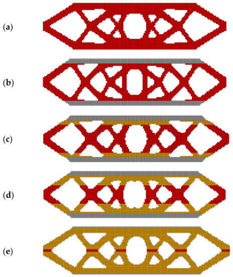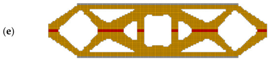 The final topologies generated for the rectangular structure for the 6 distributions of materials: E1 = 1011 Pa and E2 = 2 × 1011 Pa, indicated in Figure 6. SIMP interpolation scheme: (a) one material structure, E1—red color, minimal compliance: 14.624 × 10−4 Nm; (b) two materials structure: E1—red color, E2—gray color, minimal compliance: 10.506 × 10−4 Nm; (c) two materials structure: E1—red color, E2—gray color, including 4 layers of FGM interface—yellow color, minimal compliance: 10.110−4 Nm; (d) two materials structure: E1—red color, E2—gray color, including 8 layers of FGM interface—yellow color minimal compliance: 9.748 × 10−4 Nm; (e) FGM structure: E1—red color, E2—gray color, FGM—yellow color, minimal compliance: 9.338 × 10−4 Nm.
