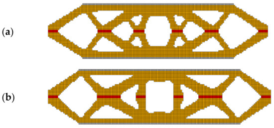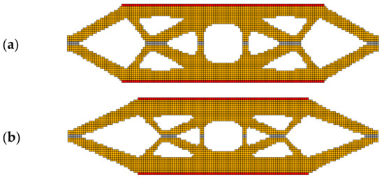 The final topologies for the FGM structure: E1—red color, E2—gray color, FGM—yellow color; RAMP interpolation scheme: (a) E1 = 1011 Pa E2 = 2 × 1011 Pa, minimal compliance: 9.330 × 10−4 Nm; (b) E1 = 1011 Pa E2 = 1012 Pa, minimal compliance: 3.706 × 10−4 Nm.