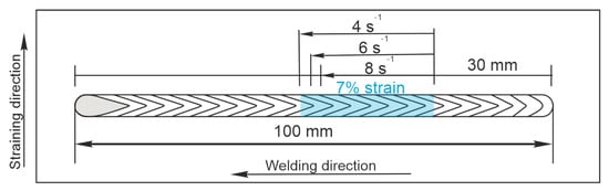 The welded specimens were subjected during welding to a strain of 7% at three different strain rates 4 s , 6 s and 8 s. The strain was applied after 30 mm after the start of welding with the corresponding (strain rates). Afterwards, the applied strain was kept until the end of welding. Figure 2 shows, schematically, the CTW test procedure during the welding process.