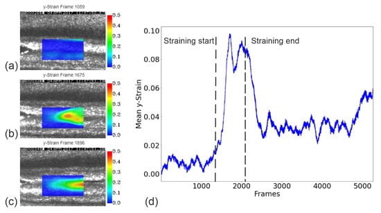 Strain distribution and three moments for the test data T2 (a) before the straining starts, (b) at the crack initiation moment, and (c) after the initiation and during the propagation of the crack. (d) Average strain history for the selected ROI over the frames.