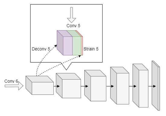 First, the output of the previous layer are expanded through a deconvolution operation (purple cuboid), and an upsampled coarse strain prediction is generated (red cuboid) in a similar way. The corresponding feature maps with the same resolution in the encoder stage (green cuboid) can be reused to preserve the earlier information and prevent the loss of details. These three components are concatenated and used as the input to the next layer. This operation is repeated 5 times to obtain the strain field with the same resolution as the input, instead of bilinear interpolation in FlowNet, which may reduce the quality of results.