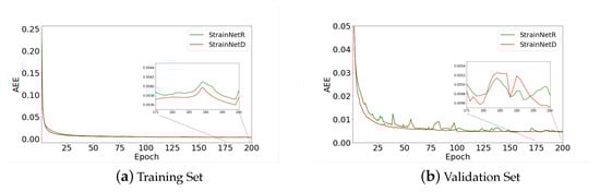 where H and W are the height and width of the image, and is the total number of pixels. The optimization method is Adam with default parameters and . The learning rate is initialized with and then divided by half at 100 and 150 epochs. A ROI area with the size of near the melt pool is selected. The total training epoch is 200 rounds. Figure 8 shows the AEE of two networks on the training set and verification set in all epochs. It can be seen from the figures that the convergence of StrainNetD is slightly faster than that of StrainNetR, but this advantage is small. The AEE on the validation set of StrainNetD is finally reduced to , which is 6.3% less than that of StrainNetR.