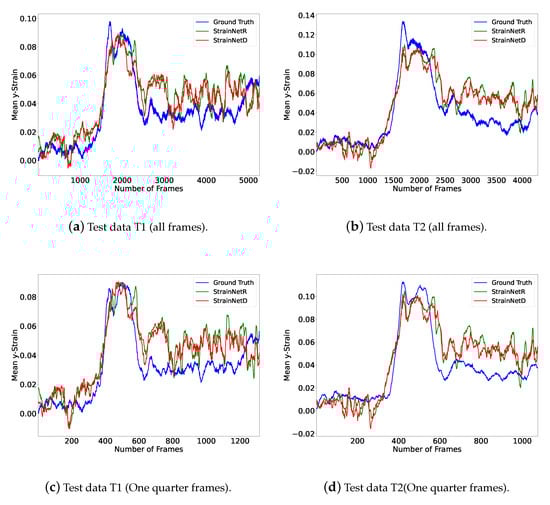 As mentioned in the introduction, cracks start to occur when the strain accumulates and exceeds a critical value. Figure 9 reflects the range of crack initiation and growth; the vertical axis is the average strain in the y direction of each frame. In test data T1, the crack appears at around 1400 frames, and the mean values predicted by StrainNetR and StrainNetD both rise sharply at this time. Although there is still an error at the peak value of the strain, the range of crack generation is roughly consistent with the ground truth. Both networks can correctly detect the crack range.