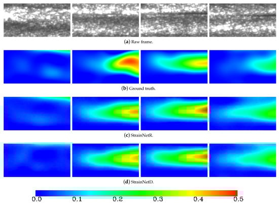 Figure 10 gives some visual examples of predicted strain fields in different stages; the range of the color bar is set according to the strain values of all frames. The first image is the normal state. The second and the third images are stages when a crack starts to occur and propagate. The deformation increases obviously at these stages, and the strain values begin to accumulate. In the last image, the crack begins to shrink and disappears gradually. Although the endpoint error of StrainNetD is a little smaller than that of StrainNetR, this difference is almost invisible in the figure; the two networks give similar predictions during crack initiation and propagation.