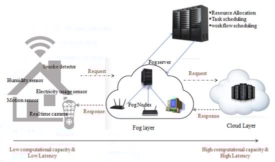 The modern era of the Internet of Things (IoT) has made our world connected in a smarter way. Here, a thing can be a person with a wearable device, an animal with a biochip, or any device with a built-in sensor that can be associated with an IP address to transfer the data over a network. The IoT has become one of the most-important technologies of the 21st Century by which we can connect our home appliances, workstations, cars, baby monitors, and many other devices to the Internet and communicate with them. The IoT connects billions of devices, human beings, and computing elements in order to make decisions and act accordingly. The IoT has started a new industrial revolution worldwide known as Industry 4.0, which has changed the entire manufacturing industry. The emerging 5G technology is the key to Industry 4.0. The high speed and low latency of 5G is very effective for automation, healthcare, media, and entertainment. 5G will be responsible for critical communication in real-time, which means that data can be accessed reliably and securely in a wireless manner. The concept of the IoT has existed for a long time, but the advancement of technologies such as low-power sensor technology, cloud computing platforms, artificial intelligence, and machine learning has resulted in hands-on experience for the IoT. Cloud computing platforms for storing, processing, and analyzing the data generated from a large number of connected devices became a great innovation for the IoT, but this has brought many challenges with respect to their centralized architecture [1,2]. Due to the huge demand of IoT devices and location-aware services, applications are generating amounts of data that are almost inconceivable [3]. It has been estimated that the cloud alone may not be sufficient to handle the big data generated by IoT devices with respect to time-critical or emergency situations. Thus, the concept of fog computing was proposed by Cisco in 2012 to cope up with these situations [4]. This emerging paradigm of fog computing lies between the cloud and end users (IoT devices) and aims to bring storage, networking, and computation close to the end users. Fog computing extends the cloud environment to the edge of the network. Although the cloud and fog use the same types of mechanisms (virtualization, resource provisioning, task scheduling, and many others) on the same kinds of resources (storage, computations, networking, etc.), still, there are few differences between them. The fog environment is suitable for many services and applications for which cloud computing does not support them well [4,5] such as: traffic light monitoring systems, healthcare monitoring systems, connected vehicles, smart cities, homes, and many others. Sending high-velocity data to the cloud leads to the congestion of the cloud infrastructure, which further leads to high latency and violations of the QoS.