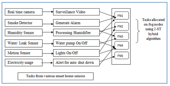 To improve the service and operation layers in fog computing, practical scheduling algorithms are required, which comprises one of the main challenges in the fog environment. Three major scheduling issues in fog computing are resource allocation, task scheduling, and workflow scheduling [8,9]. Firstly, resource allocation deals with the optimal allocation of tasks over fog nodes to improve resource utilization, provide a faster response time, and reduce the energy consumption and overall cost. Secondly, task scheduling helps with the optimal resource allocation by assigning tasks to different resources considering the task’s input time, wait time, deadlines, and the cost of performing the task as important parameters. Finally, workflow scheduling, which is also known as task-dependent scheduling, is based on the distribution of tasks on heterogeneous fog nodes. In order to identify an efficient technique for resource management and task scheduling, many researchers have built new algorithms. The quest to improve the efficiency of task scheduling algorithms to minimize energy consumption has led to a novel technique named the two-stage optimal task scheduling technique (2-ST), which could be one of the most-promising techniques for the IoT industry and its related applications. The IoT environment supports various real-time applications for time-sensitive data such as healthcare, smart cities, smart homes, smart traffic management, and many others, and it further deals with a large number of computing nodes or devices. However, due to the long response time taken by computing devices with their integration with the cloud environment, this technique provides the integration of fog computing and smart homes in the IoT environment. The main aim of 2-ST in smart homes is to understand the topology of the smart homes, provide optimal task allocation with less response time, make decisions, and act accordingly.