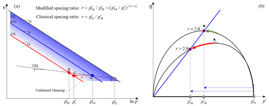 Spacing ratio of soil in (a) v-lnp’ plane and (b) p’-q plane (ICL is the isotropic consolidation line, ACL is the anisotropic consolidation line, CSL is the critical state line, URL is the unloading-reloading line, v is the specific volume 1 + e). (Modified from Figure 3 in the literature [30]).