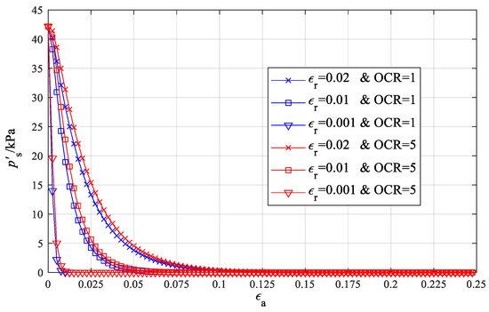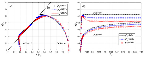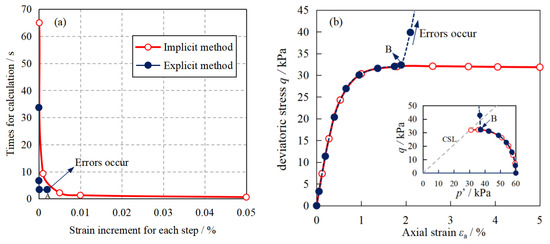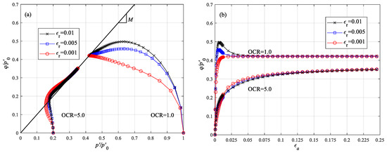 The implicit algorithm of the SBSP-R model reflects the influences of the structure strength on stress-strain and strength of normally consolidated samples (see Figure 4). The residual strength decreases as increases when OCR = 1, while the peak strength is not obviously influenced by . The sample with a larger (cb = 20 kPa) shows strain-softening behavior, and the sample with a smaller (cb = 0 kPa) shows strain-hardening behavior. This observation is in accordance with experimental tests on intact soil with bonding [33]. Reconstituted soils without bonding prefer to show strain-hardening [6]. Note, that the strain increment in the implicit algorithm does not influence the calculated results while the results from the explicit algorithm are affected by strain increment.