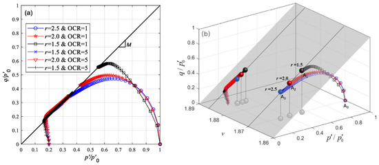 The critical state and stress-strain are well captured by the present model with r = 3.43 and = 47.5 kPa (see Figure 11), because the spacing ratio r = 3.43 is obtained from the triaxial compression test. r = 3.43 reflects the real location of the critical state in the v-lnp’ plane. The behaviors are not captured in the case of r = 2.0 and = 47.5 kPa, because r = 2.0 is just suitable for Cam-clay soils.