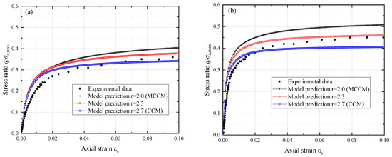 When r = 2.0 and = 0 kPa, the present model degenerates to the modified Cam-clay model. When r = 2.7 and = 0 kPa, the present model degenerates into the Cam-clay model. They are further compared in Figure 12. The experimental data are better predicted by the present model as the real spacing ratio of intact loess (r = 3.43). This indicates that the structural strength and spacing ratio should be both considered in a constitutive model to capture the critical state, stress-strain, and stress paths of soils with a bonding structure. Besides, the implicit algorithm requires less time and shows high accuracy in predicting the mechanical behaviors of Intact clayey loess, especially when the spacing ratio r is larger than 3.0.