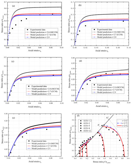 Comparisons among experimental results and constitutive model with different r (the hydrostatic pressure at critical state pcr, the derivative stress at critical state qcr, and the pore pressure at critical state ucr).