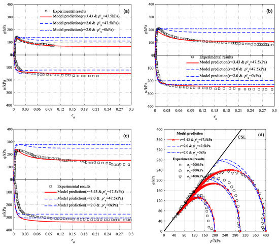 Comparisons between model prediction and test results: (a) stress-strain and pore pressure σ’3 = 200 kPa, (b) stress-strain and pore pressure σ’3 = 300 kPa, (c) stress-strain and pore pressure σ’3 = 400 kPa, (d) stress paths.