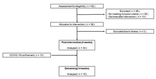 The results from a previous study with older adults revealed changes in the IKE strength (main outcome) with an effect size (ES) of 0.36 [29]. Assuming an alpha value of 0.05 and a power of 95%, a clinically relevant change between the pre- and post-intervention values of IKE strength was identified with 28 subjects using G*Power Software (version 3.1.9.7). Assuming a maximal loss of follow-up of 20%, 36 nursing home residents over 70 years old were recruited. However, two participants dropped out of the exercise intervention due to illness. Therefore, the total number of older adults who completed the 4-week training intervention was 34. Then, a subsample of 15 was re-evaluated after a 14-week inactive period after the training program. A flowchart diagram of the study with patient follow-up is shown in Figure 1.