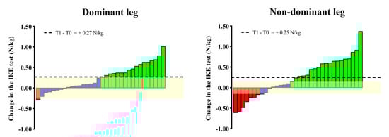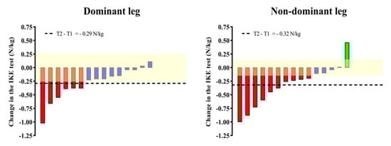 Significant (p < 0.01) declines in the IKE strength for both the dominant (ES = 0.31) and non-dominant legs (ES = 0.37) are shown in Figure 3. Changes in the group means for both legs (dominant = −0.29 N/kg; non-dominant = −0.32 N/kg) were found to be superior to the IKE test variation. Regarding the individual changes, 40% and 73% of the participants achieved changes superior to the variability threshold for the dominant and non-dominant legs, respectively.