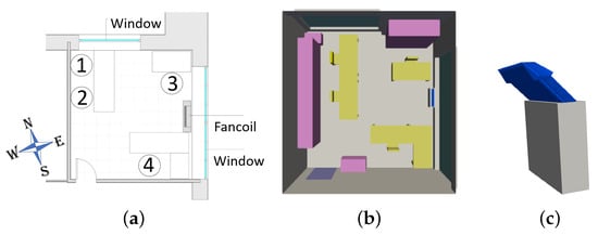 (a) Office schematic; (b) overview of the furniture layout inside the office; (c) fan-coil schematic with vector inlet at 45.