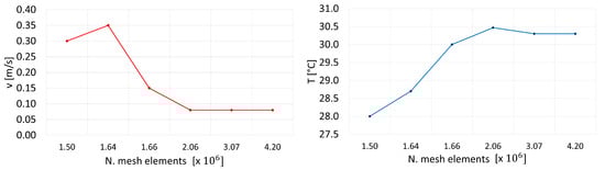 Mesh sensitivity analysis was performed to obtain the best scenario in terms of computational cost and accuracy of the results. Five different values of the base size of the mesh were considered. Velocity and temperature values in different positions inside the room were analysed. Figure 2 shows that the fourth mesh was the best choice in terms of trade-off between computational time and solution accuracy. Thus, the final mesh consisted of polyhedral elements with a base size of 6 cm.