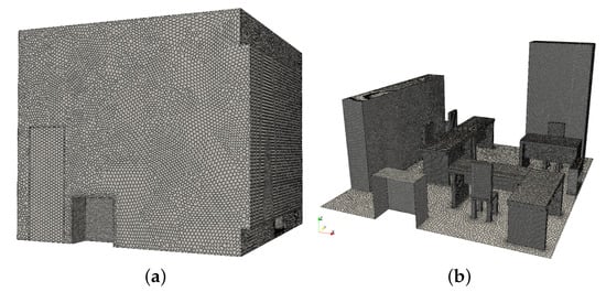 A nonuniform mesh strategy was regarded with a denser mesh in the vicinity of solid surfaces and fan-coil vents, and smoother mesh density with an expansion rate for far-field regions. A mesh refinement was performed on the furniture (4 cm) and chair (2 cm) surfaces due to their small geometrical dimensions with respect to the overall domain. In addition, a boundary layer was modelled in the fluid zone with five layers with a total thickness of 5% of the base size, resulting in a maximal y+ value of 3.5. An overview of the final mesh can be seen in Figure 3.