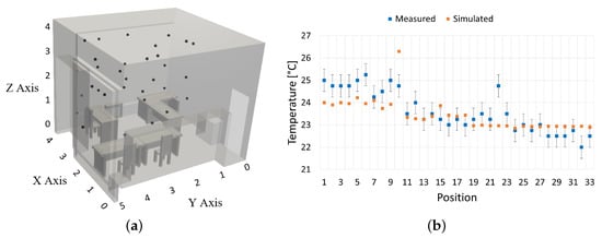 In order to evaluate the accuracy of the numerical model, 33 positions randomly spread inside the room (see Figure 4a) were considered, and temperature and velocity values were both compared with the profiles obtained via the simulation. Figure 4b shows the temperature values obtained with the measurements (considering an error bar of C) compared with the corresponding values obtained with the simulation.