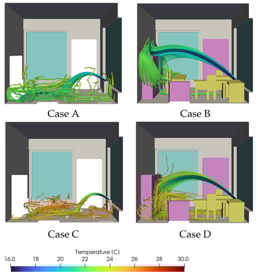 View from the entrance of the streamlines obtained for summer cooling with low input air velocity and no solar load (Case A), high input air velocity and no solar load (Case B), low input air velocity and solar load (Case C), high input air velocity and solar load (Case D).