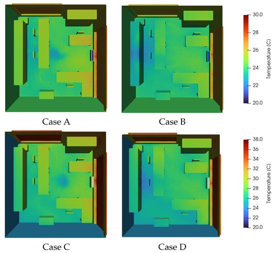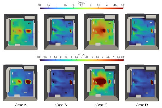 Summer cooling condition. (top subfigures) and relative (bottom subfigures) distributions in the office obtained for low input air velocity and no solar load (Case A), high input air velocity and no solar load (Case B), low input air velocity and solar load (Case C), high input air velocity and solar load (Case D).