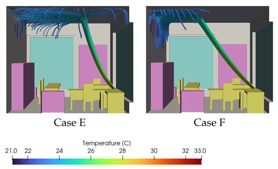 View form the entrance of the streamlines obtained for winter heating with low input air velocity (Case E) and high input air velocity (Case F).