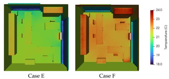 The winter-heating condition completely differed from the summer-cooling one, since the buoyancy effect on the input air forced the flow to follow the injection direction up to the ceiling, as shown in Figure 7. As a matter of fact, Cases E and F both avoided air flows that directly impacted the stations. This air distribution resulted in a massive stratification of the temperature within the office. The mean static air temperature and mean operative temperature values obtained for these cases were C, C for Case E and C, C for Case F but Figure 8 shows that the temperature on the internal furniture and walls was much lower.