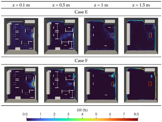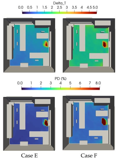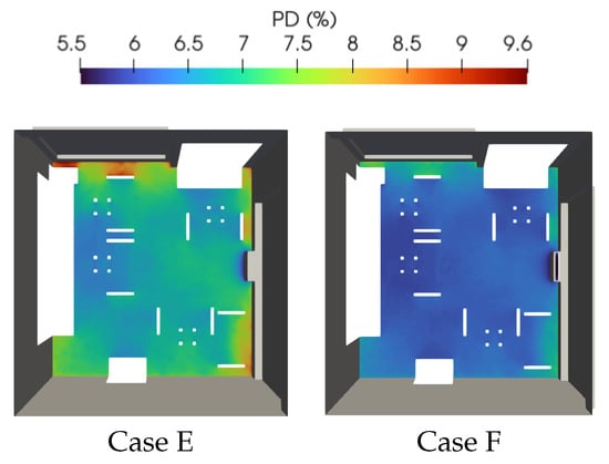 In the same way, Figure 12 shows the distribution of associated with floor temperature in the winter-cooling condition. For both cases (minimal and maximal inlet air velocities), the highest values of were found near the external walls; Case E had the highest discomfort for floor temperature.